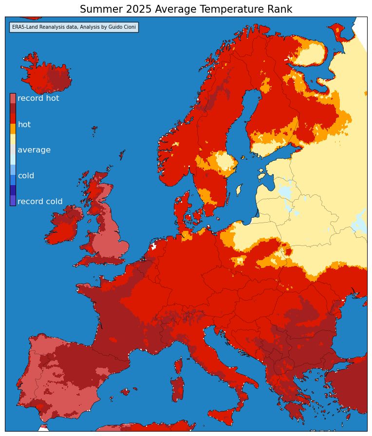 Τα δεδομένα της Copernicus Climate Change Service (C3S) δείχνουν ότι το καλοκαίρι του 2025 ήταν από τα θερμότερα που έχουν ποτέ καταγραφεί στην Ευρώπη. Ο μέσος όρος θερμοκρασίας της ηπείρου βρέθηκε σημαντικά πάνω από τις τιμές αναφοράς της περιόδου 1991–2020.